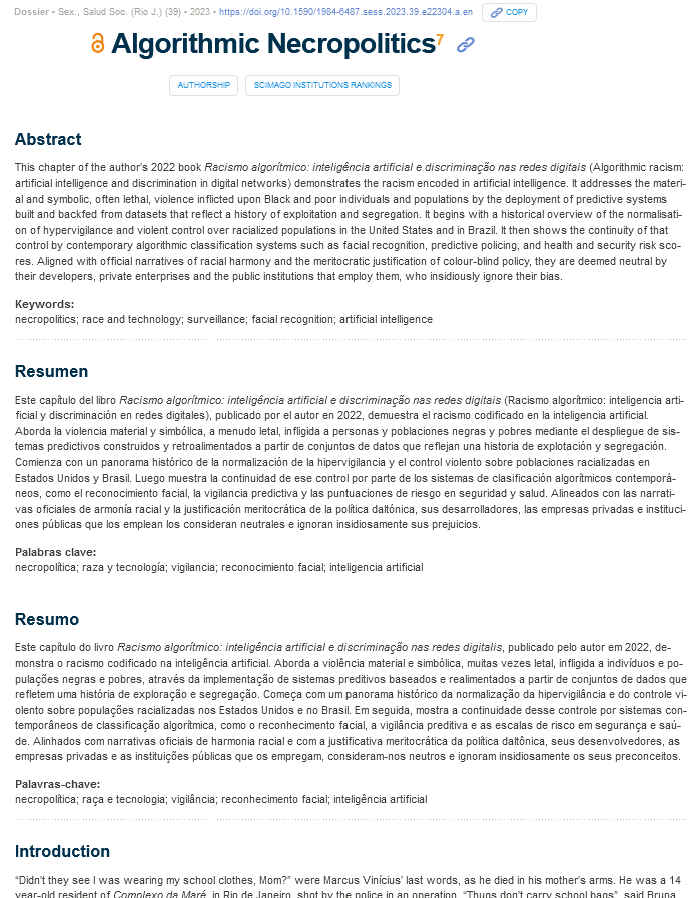 Chapter: Fighting Algorithmic RacismInput: A.I. and Racial Discrimination in BrazilInterview: How AI reinforces racism in BrazilAudiobook: Algorithmic RacismEdited Collection: Afrodiasporic Thought on Digital Communities, Activism and AlgorithmsEdited Collection: Brazilian Griots and Digital TechnologiesPaper: Algorithmic Necropolitics